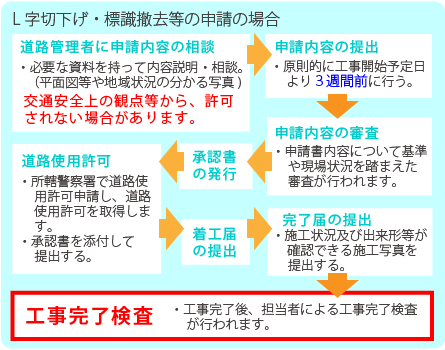 また、L型側溝の切下げやガードレール、標識の移設をする場合は、道路使用許可の他に道路管理者への申請手続が必要になります。