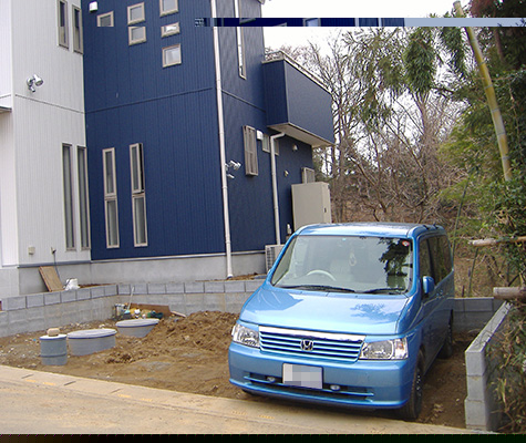 建物横の崖地に土留めのブロック塀を設置。しっかりとした土台の上に鉄骨を組んでいきます。