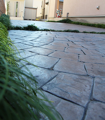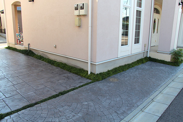 アプローチ・駐車スペースは全てスタンプコンクリートを採用しました。自然な立体感と色調が本物の石畳を想わせ、グランドカバーのリュウノヒゲが緑鮮やかに縁取ります。