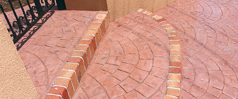 玄関アプローチのペイビング(舗装材)には、欧風石畳調のスタンプコンクリートを採用しました。スタンプコンクリートは、コンクリートが柔らかいうちに着色と成型を行うため、自然石・レンガ・タイル・木目模様などを自然な風合いそのままに美しく表現し、デザイン性に優れた景観をつくり出します。
